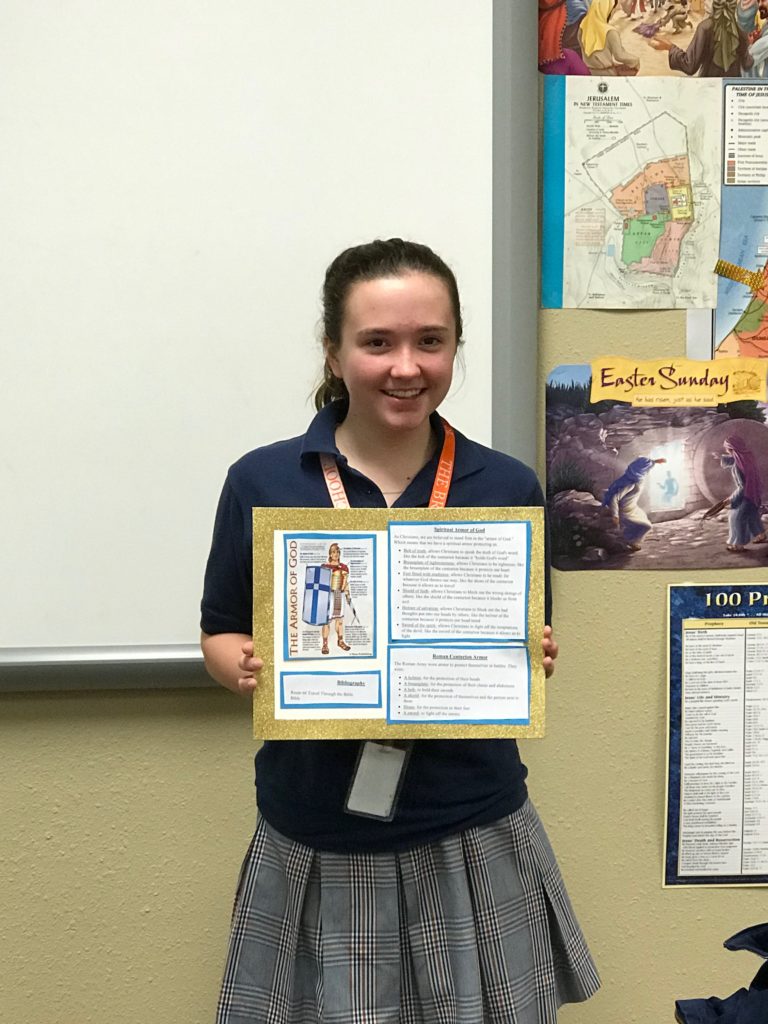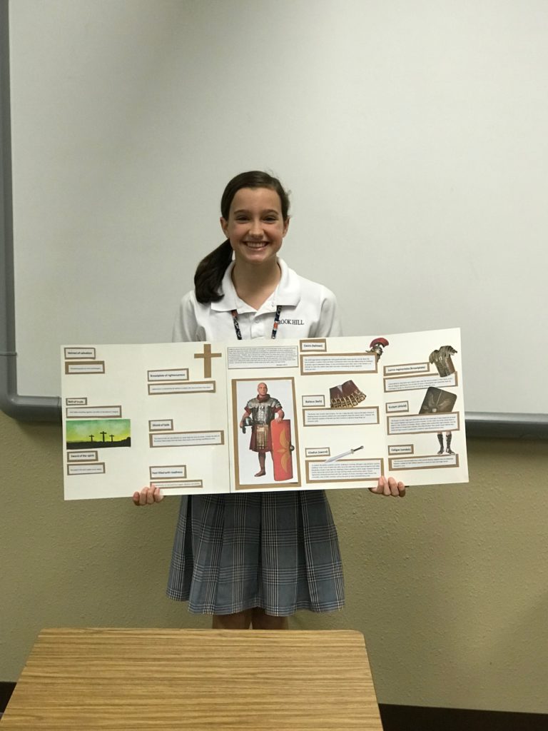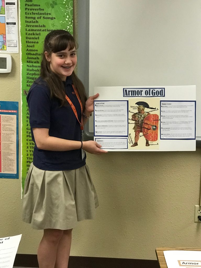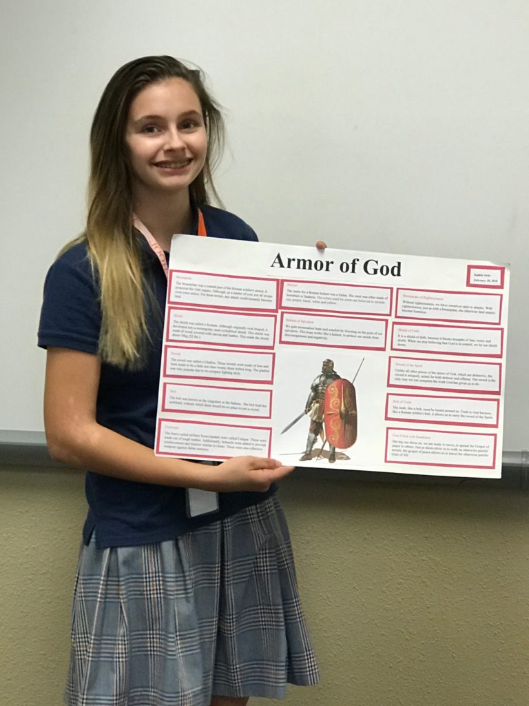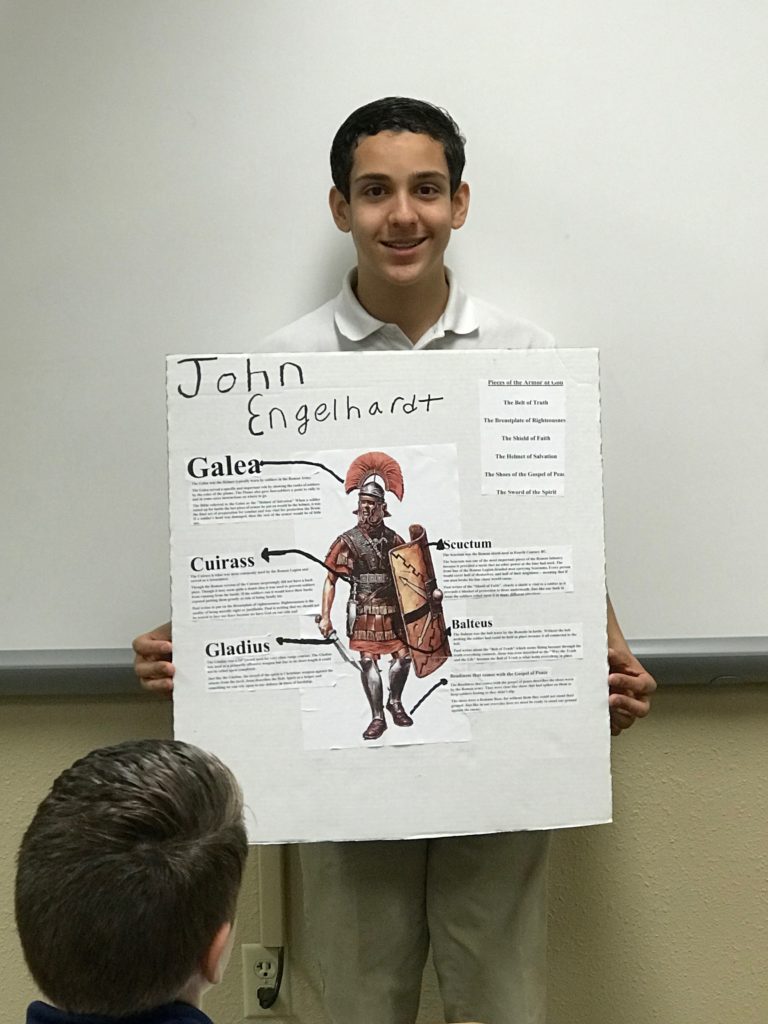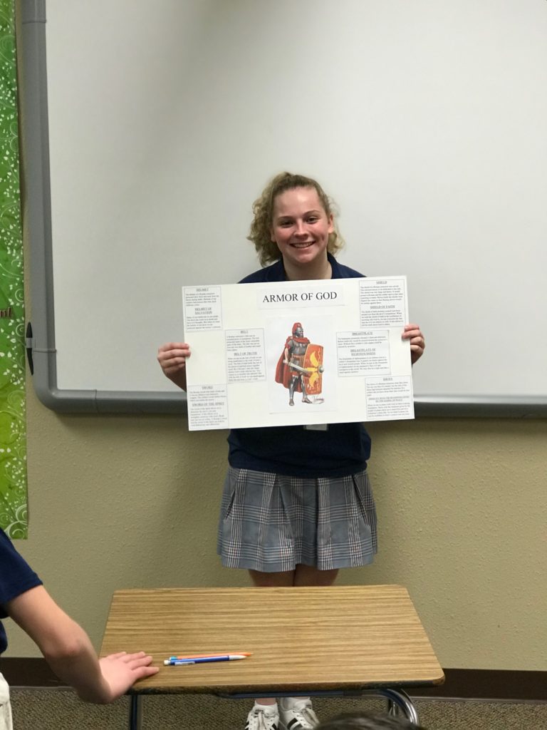 The students learned how the Romans fought as a unit and how each piece of their armor served to protect the brothers-in-arms. This allowed the students to meditate on the role and purpose of the Christian’s use of the Armor of God. These 8th graders put in a lot of thought and did some great interpretation to bring their classmates thought-provoking presentations!