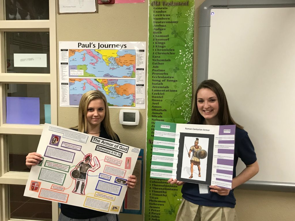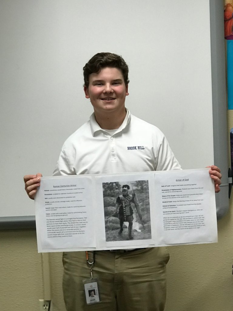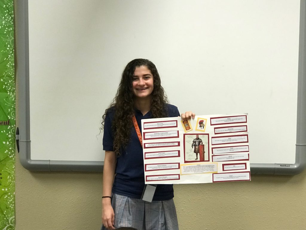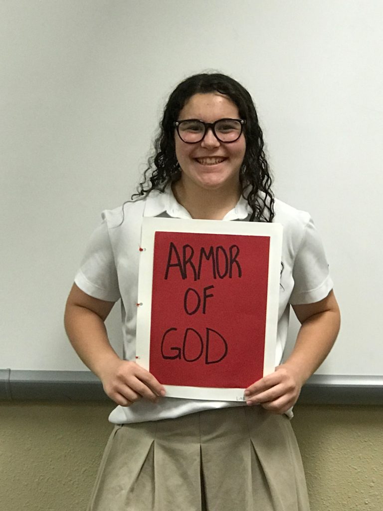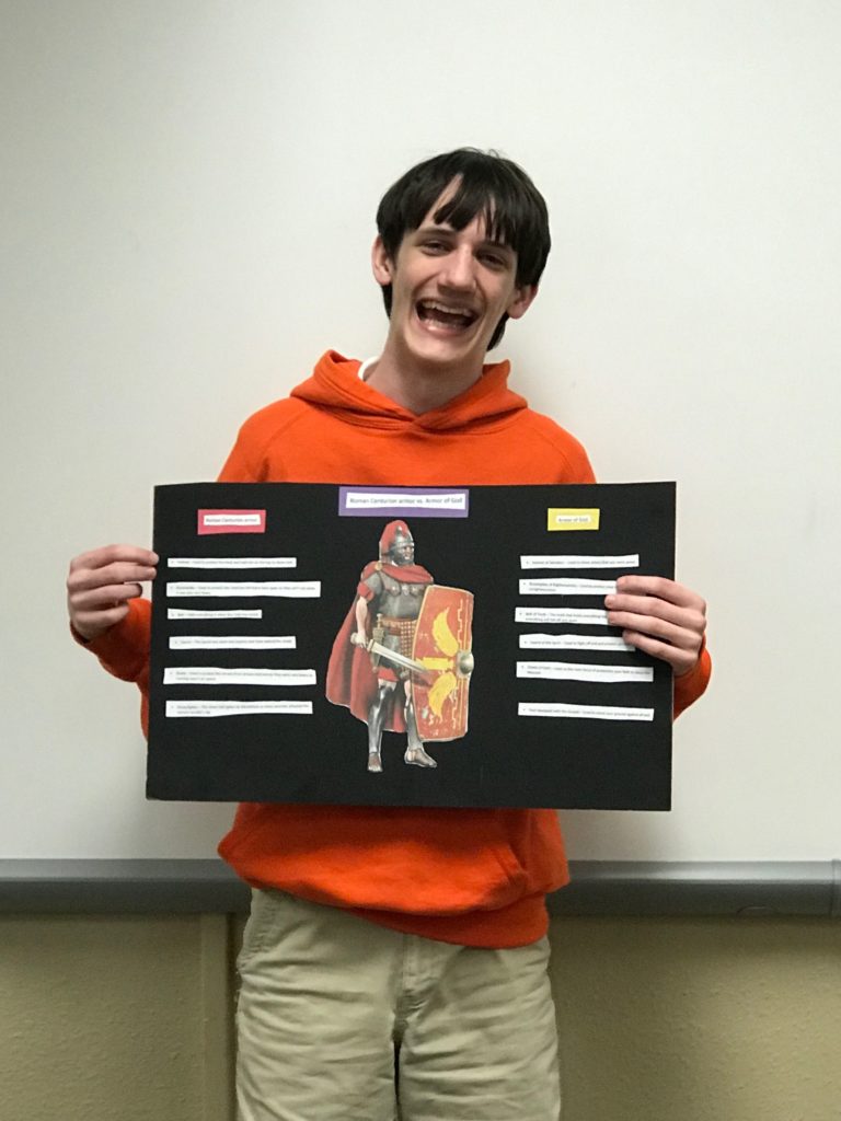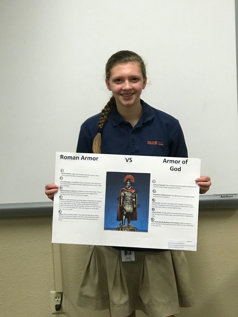 The students learned how the Romans fought as a unit and how each piece of their armor served to protect the brothers-in-arms. This allowed the students to meditate on the role and purpose of the Christian’s use of the Armor of God. These 8th graders put in a lot of thought and did some great interpretation to bring their classmates thought-provoking presentations!