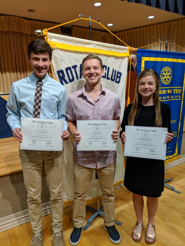Two Middle School students, two Upper School students, and Brook Hill’s Teacher of the Year were honored this week at the Rotary Club of Tyler’s annual Tyler Rotary Young Citizen’s Club Banquet at the University of Texas at Tyler Ornelas Activity Center. Students were chosen based on exceptional practices of citizenship, cleanliness, thriftiness, loyalty, courtesy, honesty, service, dependability, sportsmanship, scholarship and leadership.