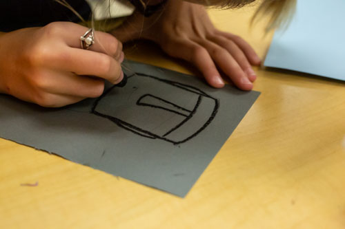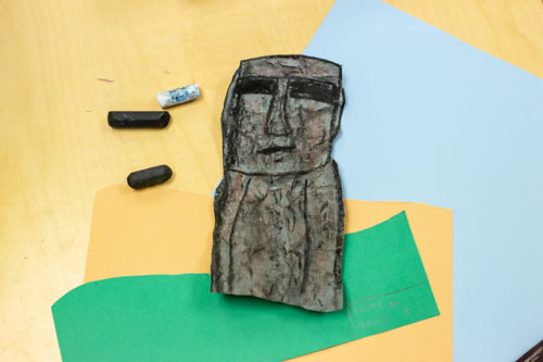 After a brief educational video explaining the history and design behind the iconic Easter Island statues, students had the chance to “build” their own. With paper and oil pastels, students drew, colored, and layered “scenes” one atop another using their creativity and personal perspective.