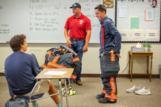 Last week our 8th-grade math class got hands-on experience with a firefighter from the Flower Mound Fire Department, Mr. Parish, who showed them the importance of a solid math foundation. During the class, he showed them how critical decisions need to be made based on the calculations of the fire scene. For example, if someone at the scene is injured and they need to administer fentanyl for pain management, they need to use math to calculate how much to give them specifically based on their weight.