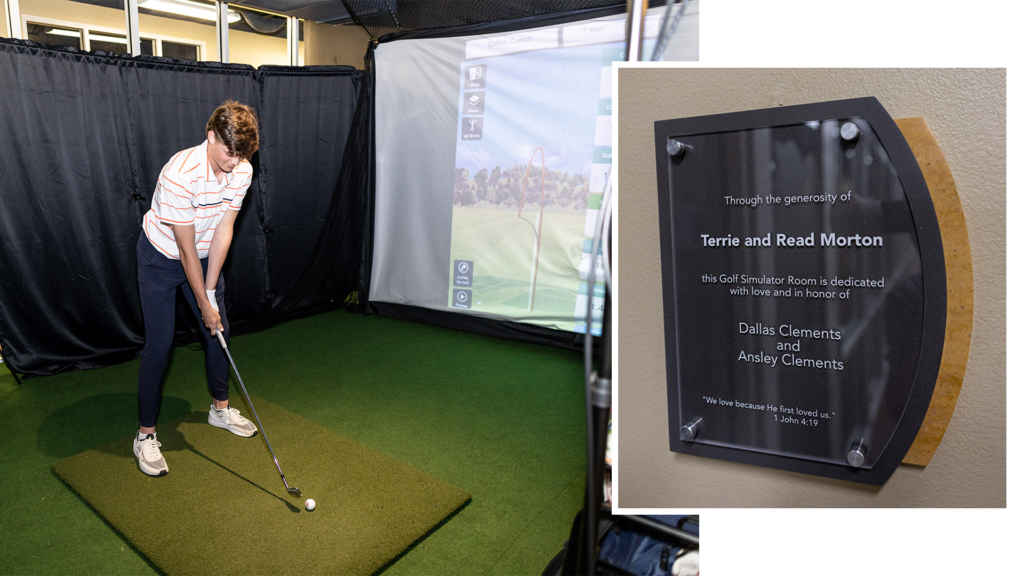 Our golf simulator is a vital tool for our athletes to practice and improve their golf game – in rain or shine! Last week, our men’s and women’s golf teams got to celebrate the name dedication of this gift to our athletic department by Terrie and Read Morton.