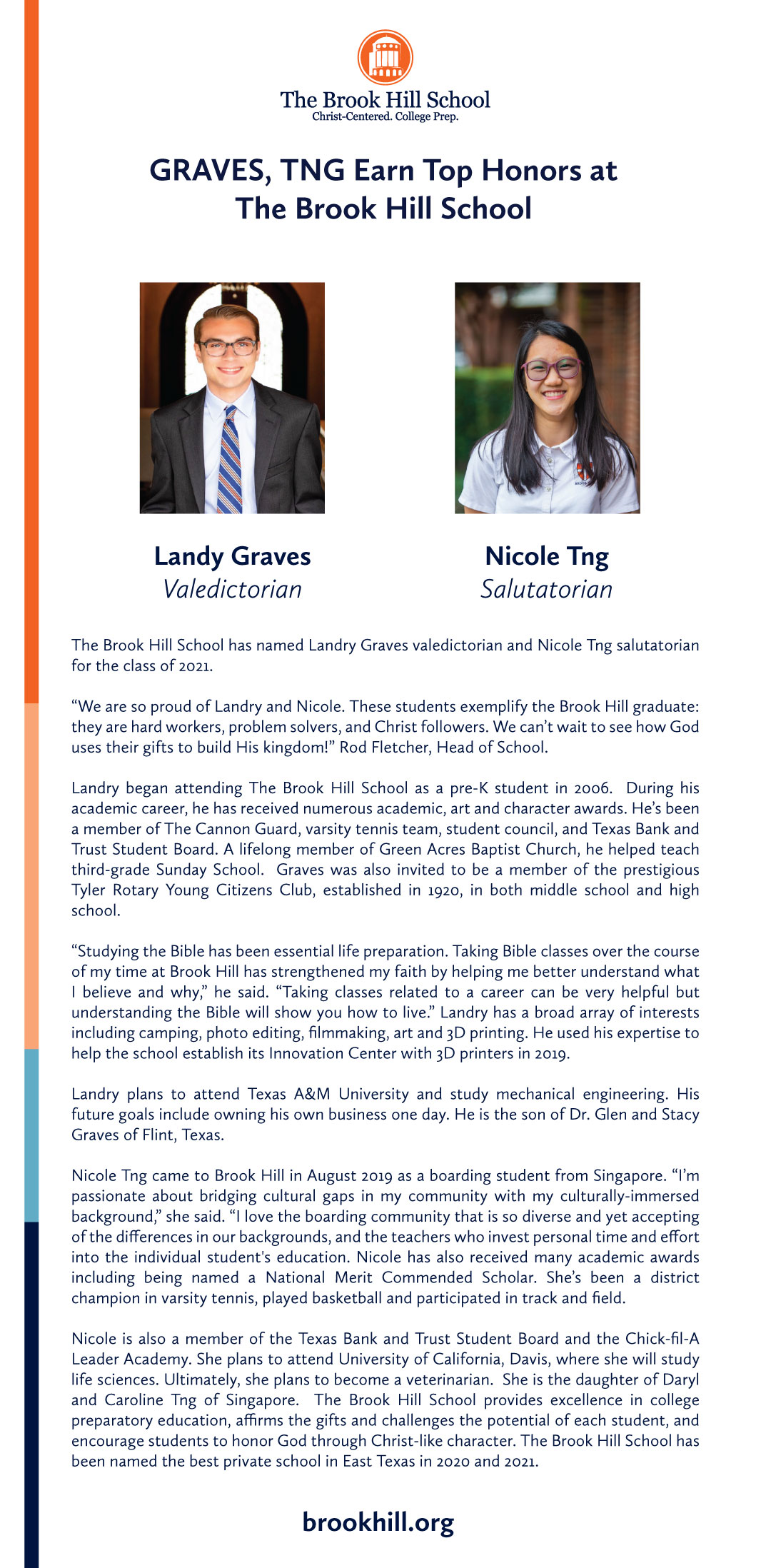 The Brook Hill School has named Landry Graves valedictorian and Nicole Tng salutatorian for the class of 2021.