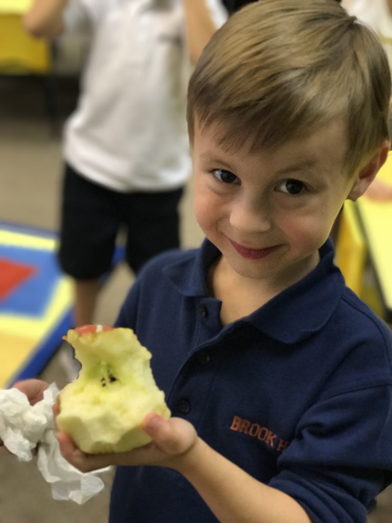 Kindergarten is learning about apples this week. Today, each student brought an apple for our Math/Science lesson. The students decided how to sort the apples. Their ideas were color, size, stems, stripes, dots and bumps. Next, we used our five senses to describe the apples. Apples can be loud when 15 children are crunching at the same time!