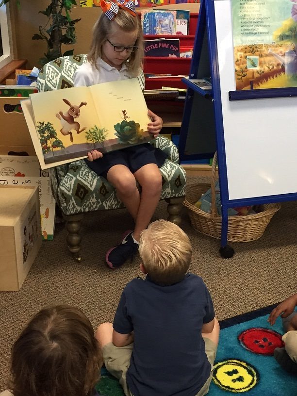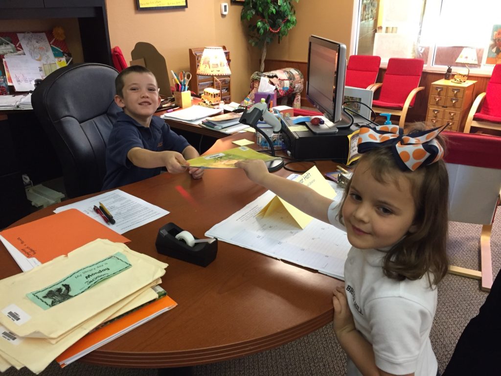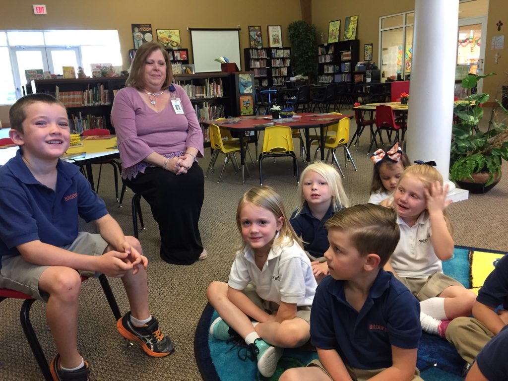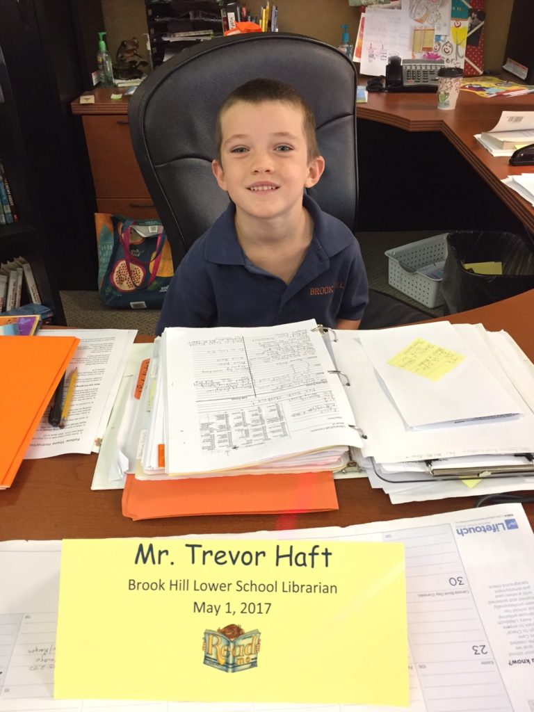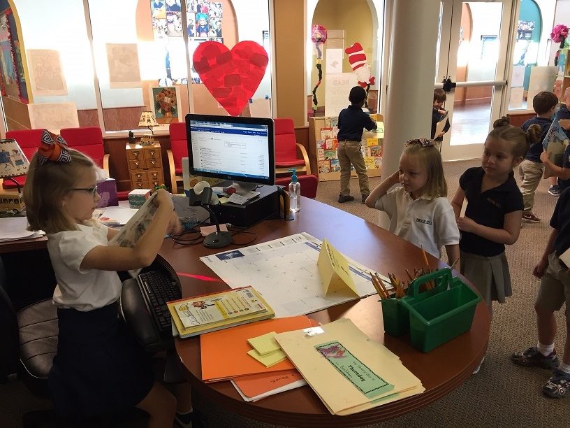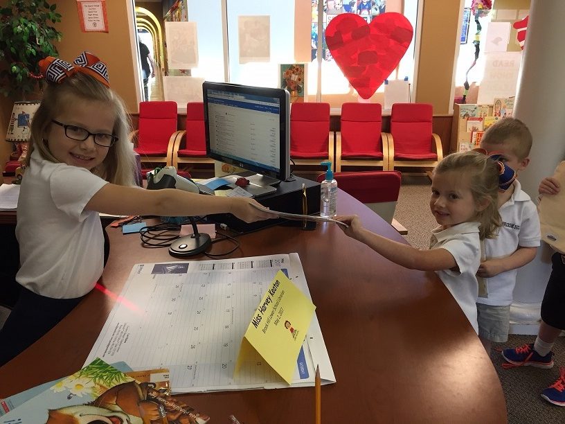 Two students recently won the raffle to be a librarian for a half day at the Lower School. Trevor, a Kindergarten student, and Keaton, a first grader, checked books in and out, read to students and helped out in the computer lab. These students were so capable that Mrs. England was even able to relax and read for a few minutes!
