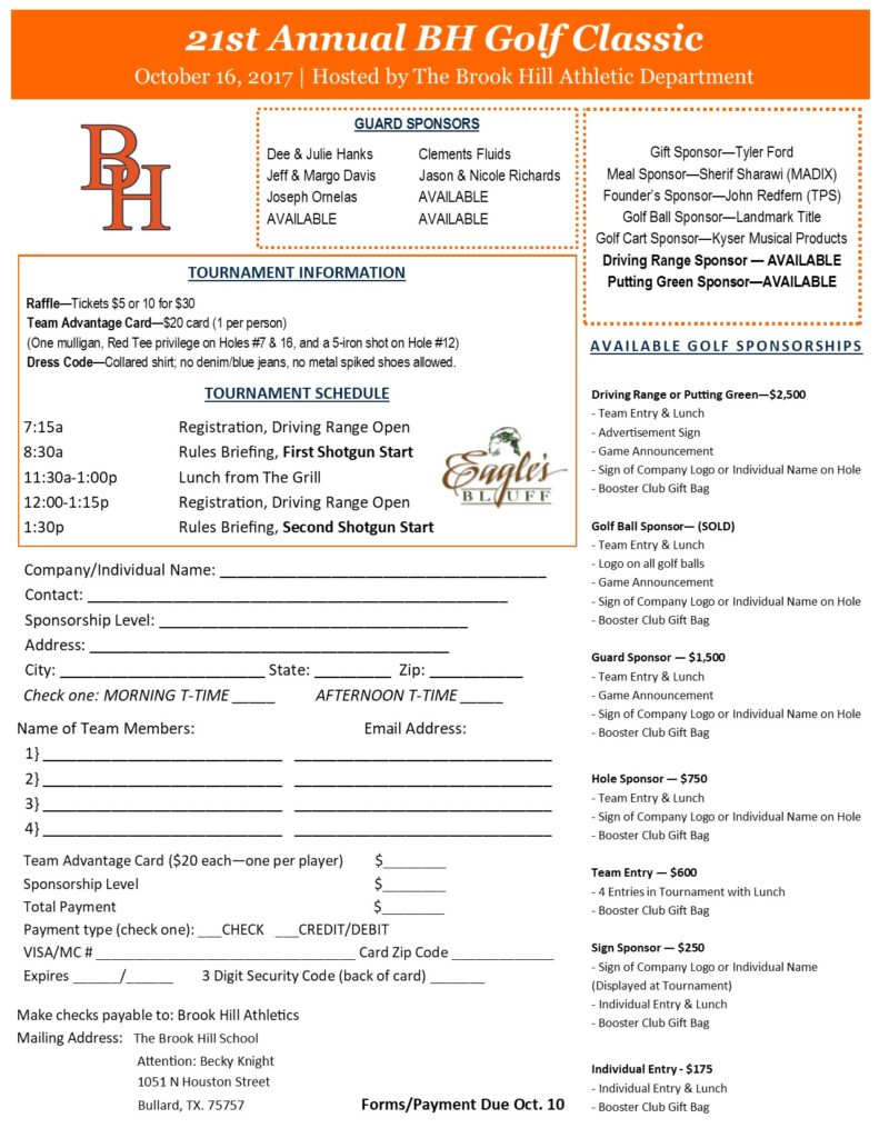 The 21st Annual Brook Hill Golf Classic will be held at the beautiful Eagles Bluff Country Club on Monday, October 16th. Two Tee-times are available for golfers with a morning start at 8:30 a.m. and an afternoon start at 1 p.m. The BH Golf Classic is the single largest event held by the Brook Hill Athletic department to generate funds for student-athletes.