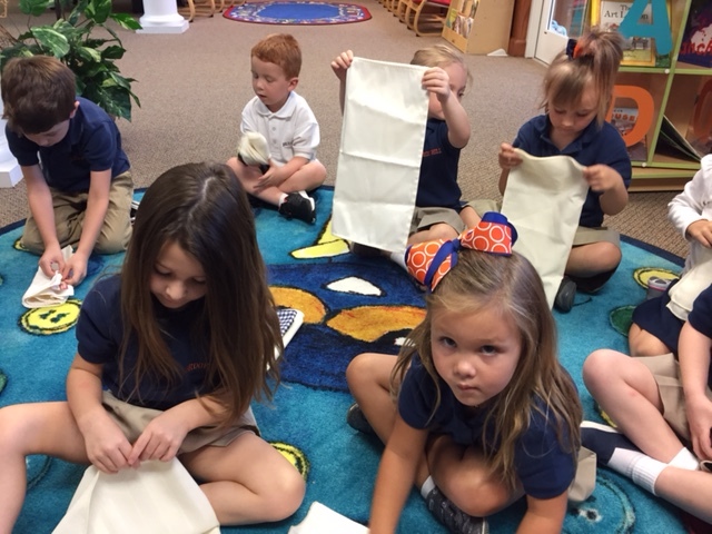 In the story, Knuffle Bunny, by Mo Willems, Trixie and her father visit a laundromat. We talked about washing and drying clothes and then students practiced folding napkins. Now they can help Mom and Dad with laundry chores!