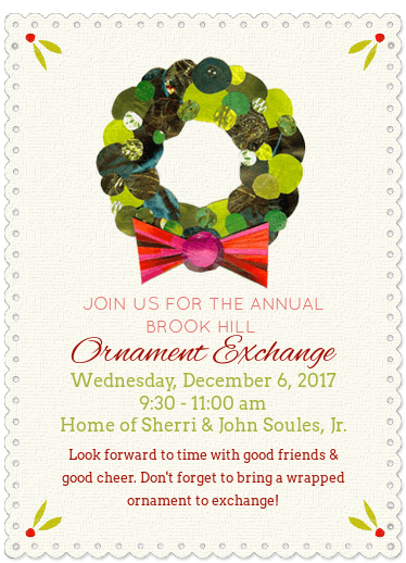Spread holiday cheer and join us for the annual Brook Hill Moms Ornament Exchange!