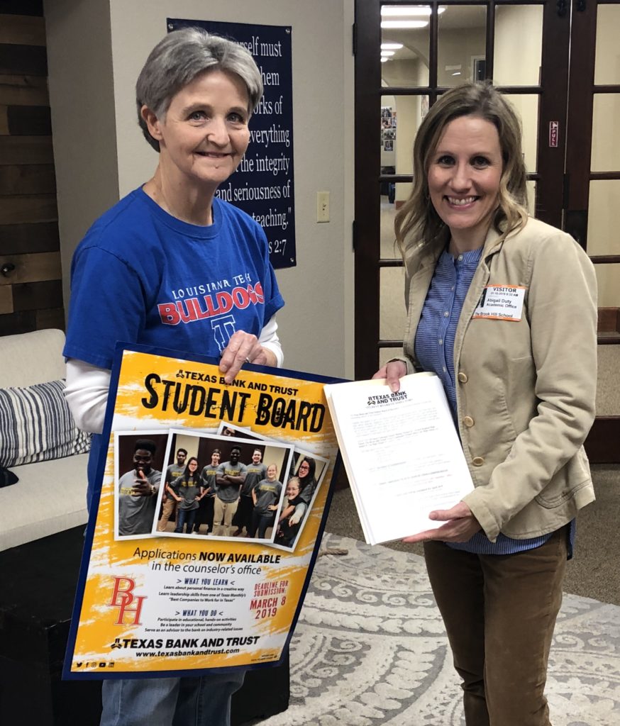 The Texas Bank and Trust Student Board of Directors applications have arrived on campus at Brook Hill! The TB&T Student Board is a prestigious program recognizing outstanding high school seniors in the community.