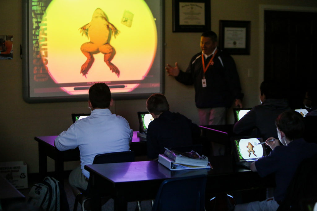 Coach Collins’s class practiced dissecting frogs via tablets today. The real frog dissection will happen next week, but this way they will be prepared for where their incisions go and what they will be examining.