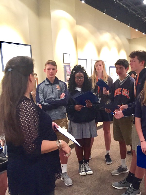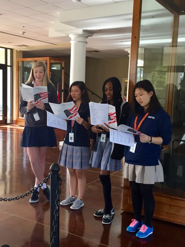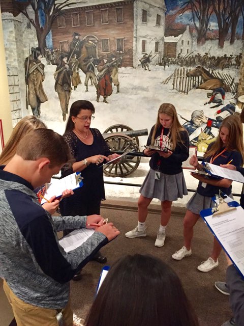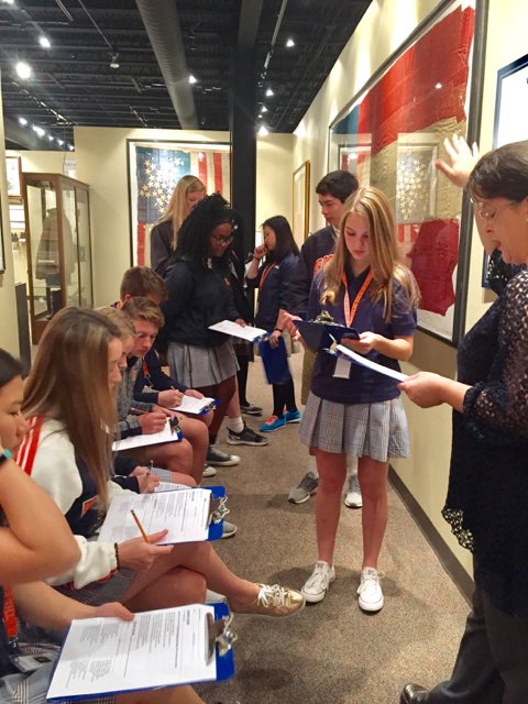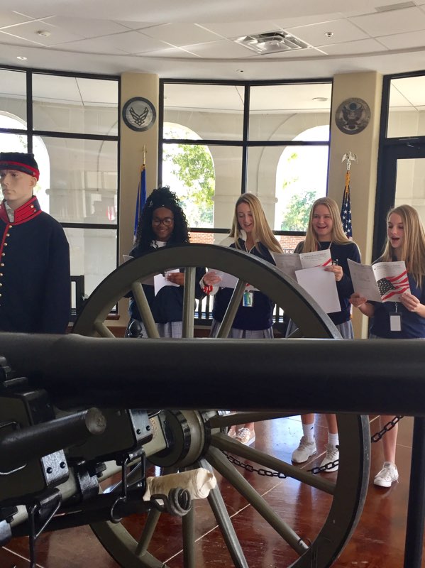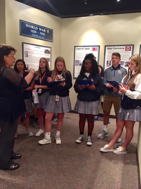 The JV Choir spent a class period in the museum recently hearing about the history of the five military hymns. The students learned how each of the five branches of the military developed their songs, highlighting the history and purposes and ambitions of each branch. One of the highlights of the lesson was learning about the grandfather of one of the choir students, Timothy Humphries. His grandfather fought in World War 2 and was in the Navy. Mr. Humphries’ actual uniform that he wore in WW2 is on display in the museum. After the lessons, the students gathered in the lobby and sang through an armed forces medley.