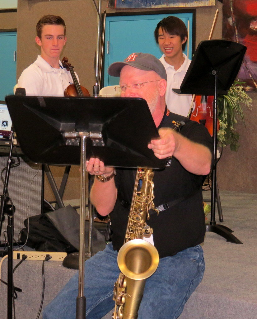 Mr. Gardner played some Jazz tunes in between songs and the other string and wind players performed about six songs. Vn 1: Cole Fitzgerald, Tyler Tan, Vn 2 Denise Tan, Viola Holly Stadelmann, Cello Hayden Gardner, Clarinet Alan Zhu and piano Bolun Zhang.