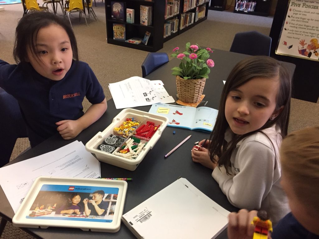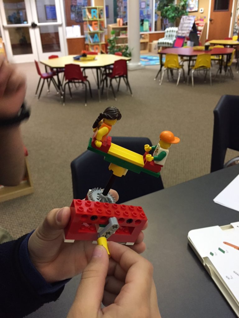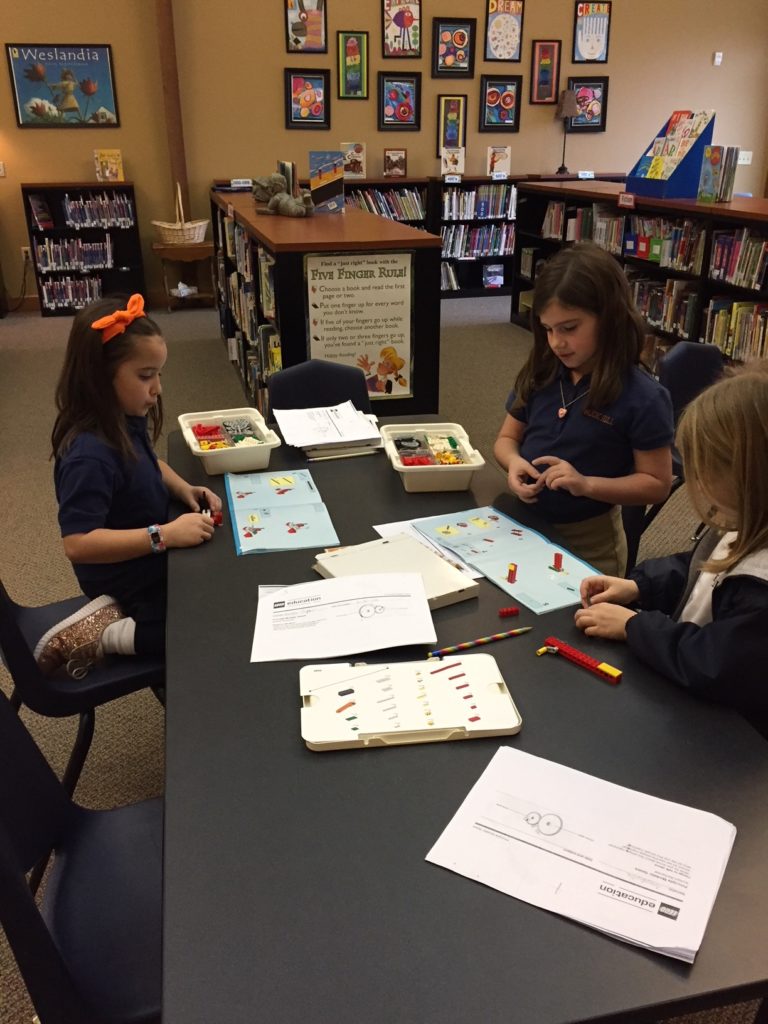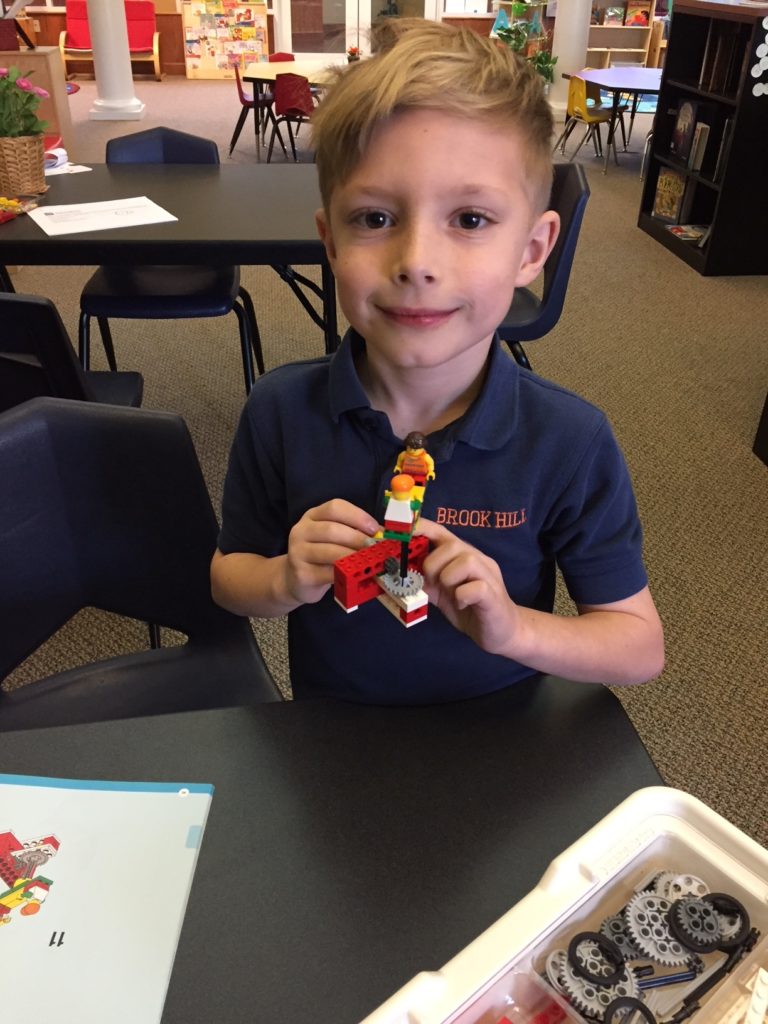 The second grade library LEGO club allows students to work as young scientists and engineers as they construct, investigate, and understand the operation of simple and compound machines. Students built constructions using gears and explored how to change the direction of rotation, increase or decrease the speed of rotation. Testing constructions, problem solving and collaborating with a partner are key components of this program.