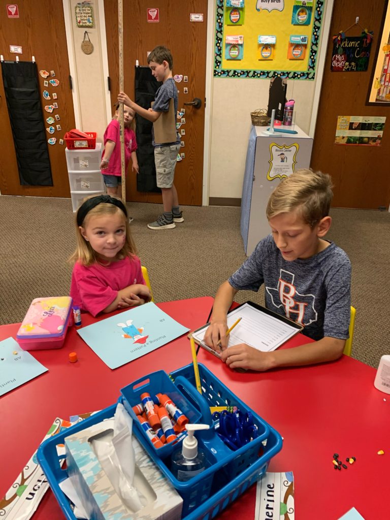 The first meet and greet included time for the 5th graders to interview the little guys to get to know them better which included questions like, “what size shoes do you wear? What’s your favorite color? And which food do you love most?”. Each 5th-grader got to use this information to compare with their own answers to the same questions, which further builds rapport as similarities and differences are shared! This may seem like a simple thing to do, but we’re watching it develop our students’ communication and connection skills with others and that’s such a fun thing to see grow!