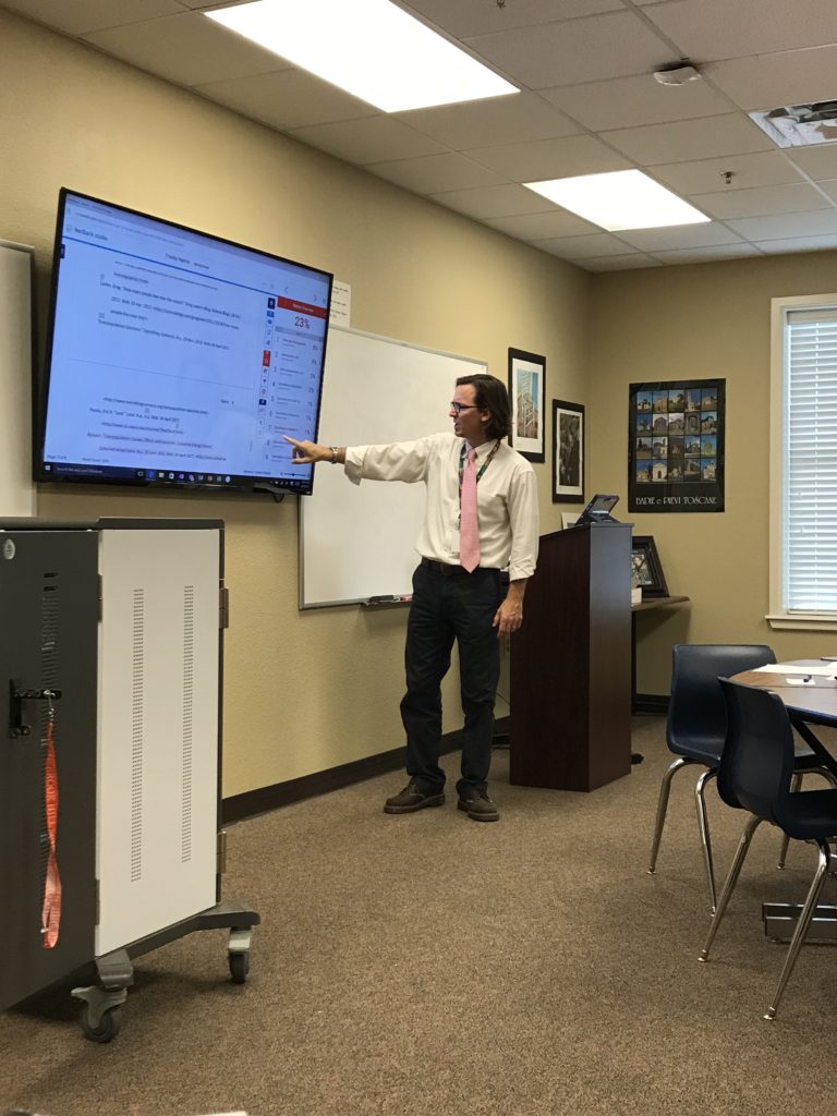“What’s more, as a teacher, this semester I plan on using TurnItIn’s feedback studio to mark student essays and give written feedback,” Travis said. “This way, students can sign into their account, see how they scored on the essay and read my type-written comments on various pieces of their essays. I have graded essays via the use of typed comments before (in Microsoft Word), but not via an interactive website. So this should be a new experience for all of us—teacher and student alike. I am hopeful that each student is able to see how they scored on their essays; more than that, I’m hopeful that through the use of TurnItIn, they’ll further improve as writers and be even more ready to tackle writing assignments in college.”