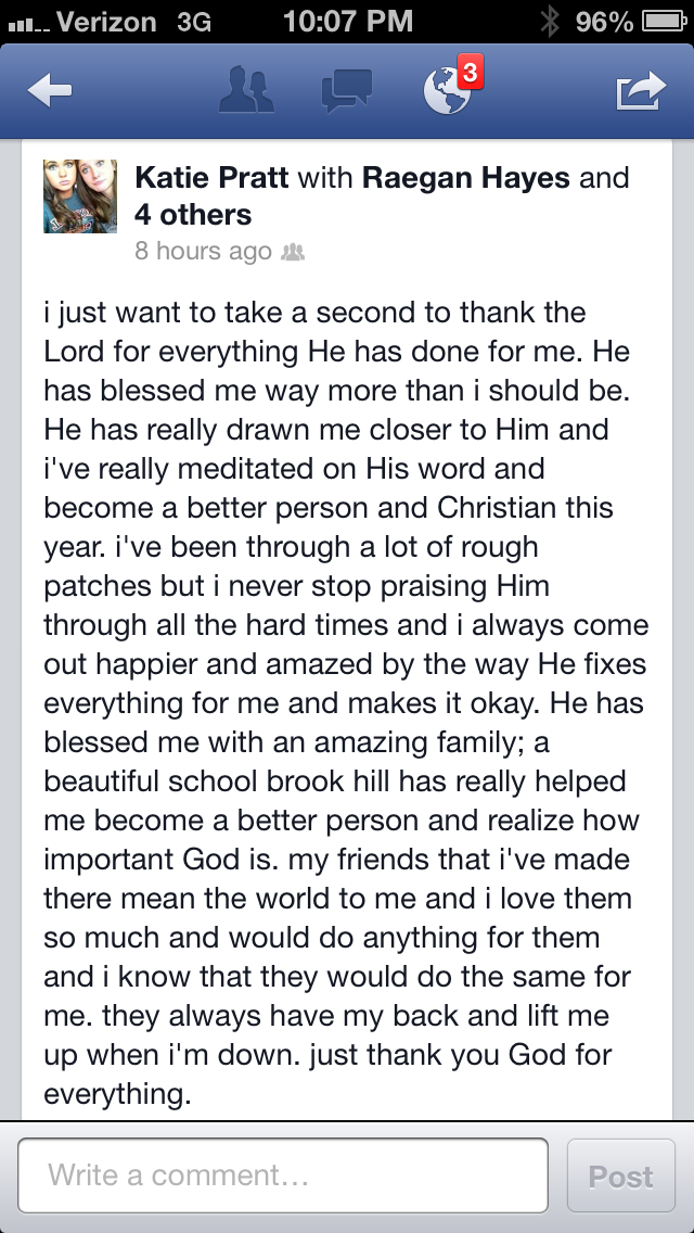 I received an email this week from BH mom, Mindy Pratt, sharing a post her daughter made on Facebook. Katie Pratt, 9th grade, has been a student at Brook Hill since she started at the Lower School in 4th grade. This post is an answer to her parents’ prayers and to ours at Brook Hill. It is always humbling to hear what an impact for the Lord this school makes in the lives of some students.