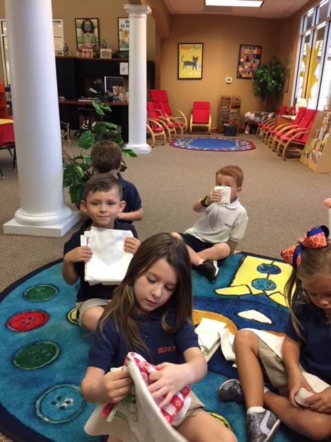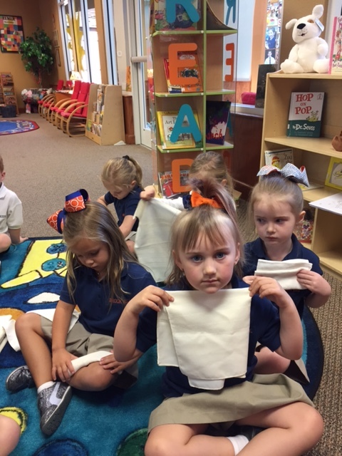In the story, Knuffle Bunny, by Mo Willems, Trixie and her father visit a laundromat. We talked about washing and drying clothes and then students practiced folding napkins. Now they can help Mom and Dad with laundry chores!