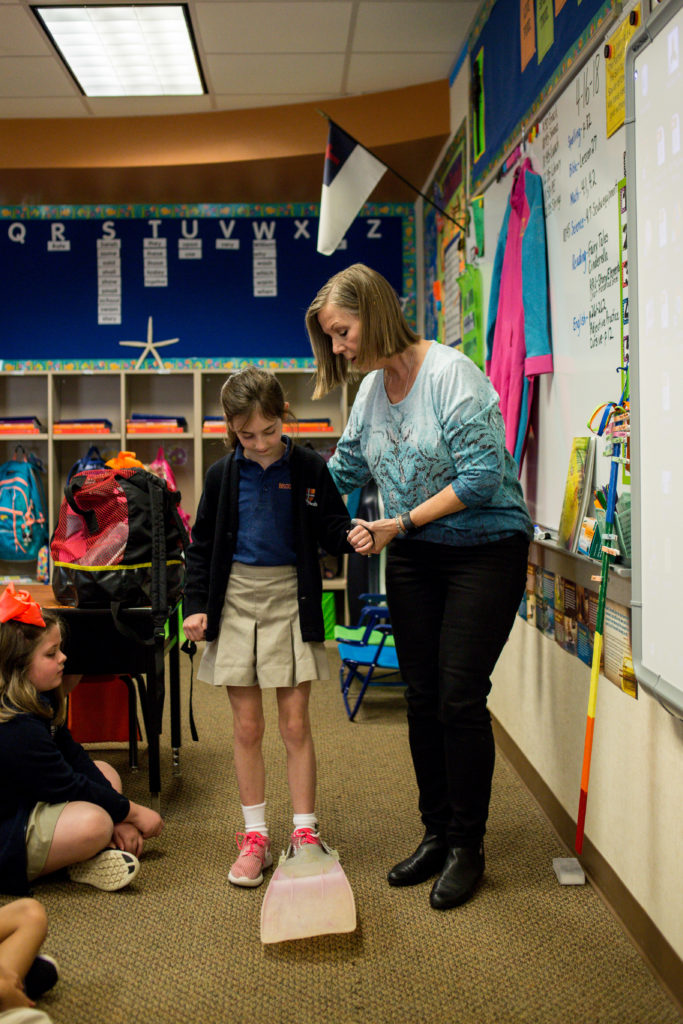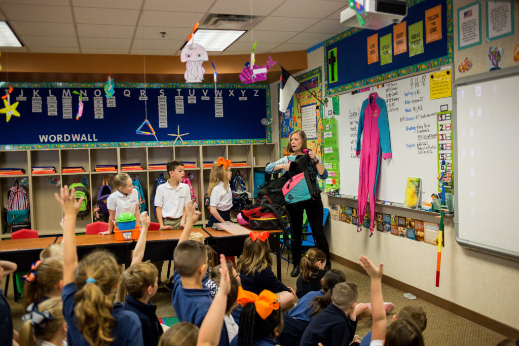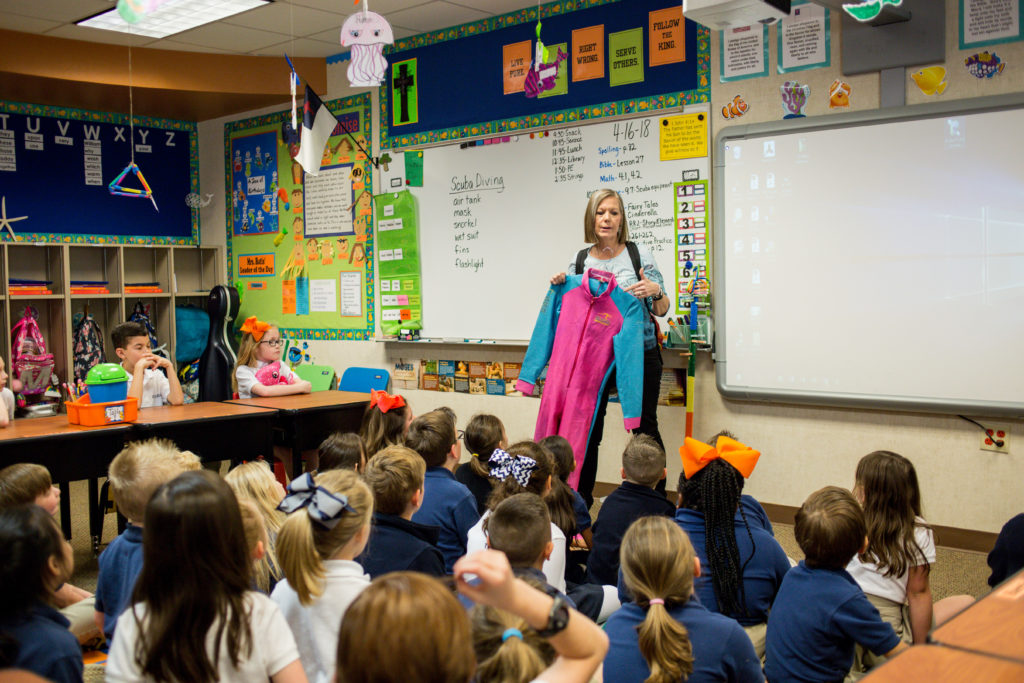 Second Graders have been studying the ocean. As a culminating lesson, Mrs. Batis brought her scuba gear to school for a lesson to all Second Graders. Students learned the names of the equipment and the uses. Some students tried on the equipment to get a feel of what it would be like. Mrs. Batis shared personal experiences with the students about her diving over the last 30 years. She also shared personal pictures of coral, fish, sea anemones, sponges, sea fans, etc. At the end, the students viewed a 6-minute video that showed life in an ocean.