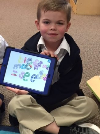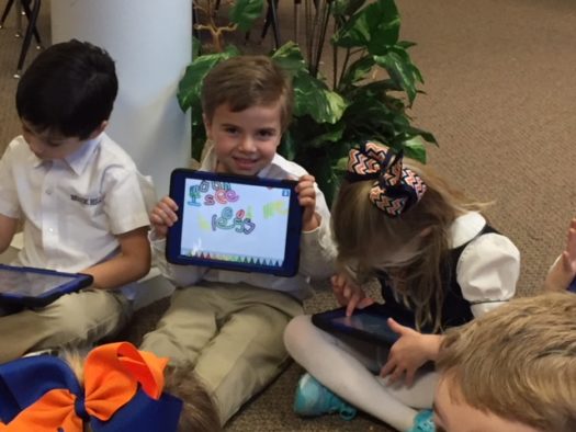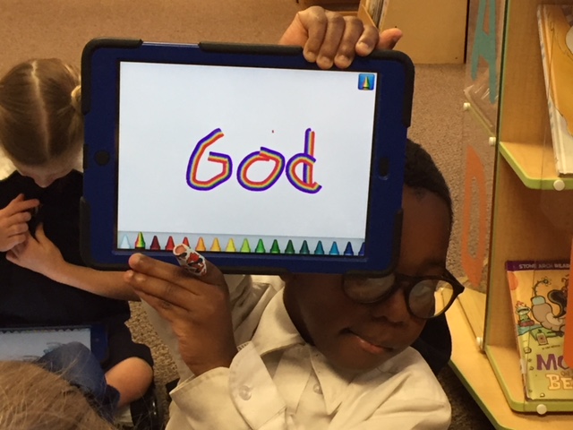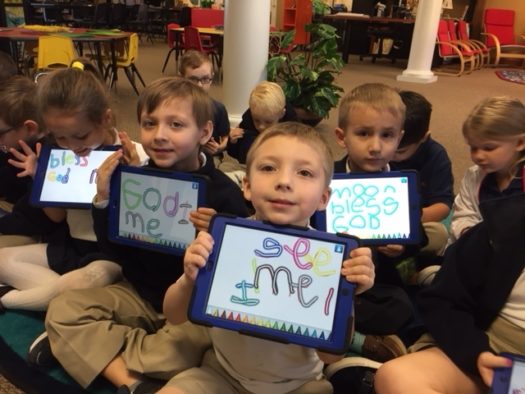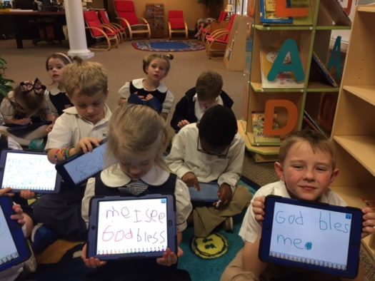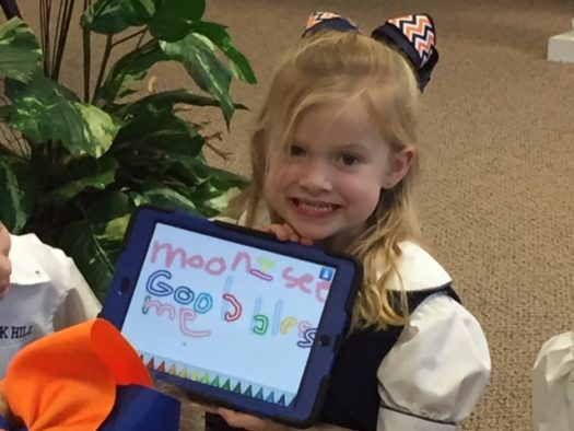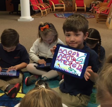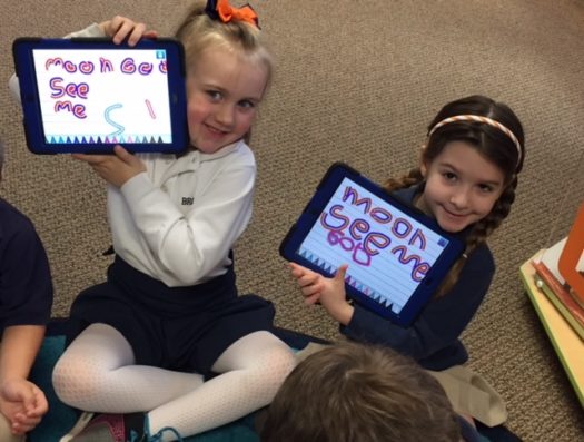 Using iPads to write sight words After reading stories and poems about the moon in the library, PreK and Kindergarten students used the Show and Tell App to practice writing their words in a creative way.